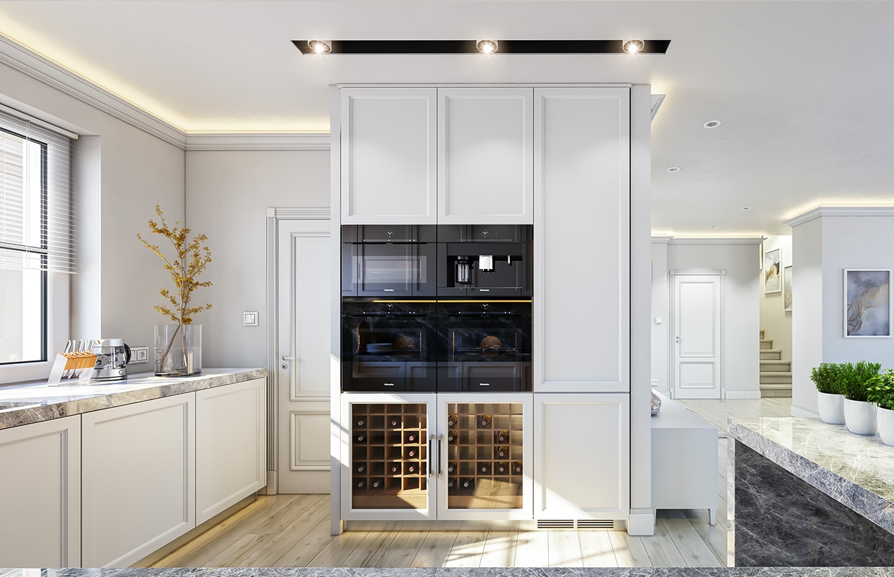 Do domu wchodzimy reprezentacyjnymi drzwiami do dużego przedsionka z szatnią. Sień jest połączona bezpośrednio z holem i otwartą przestrzenią dzienną, na którą składa się salon, jadalnia i kuchnia. Kuchnia jest częściowo schowana za ścianą spiżarni i zabudową mebli kuchennych. Centralnym elementem salonu jest środkowa ściana kominkowo – telewizyjna. Podniesiony sufit salonu oraz piękne okno otwierające wnętrze na taras dodają atrakcyjności wnętrzu.