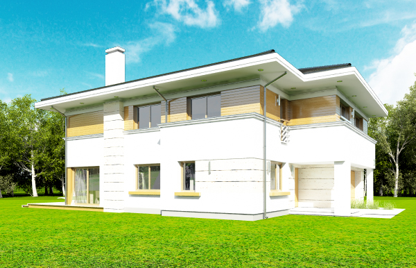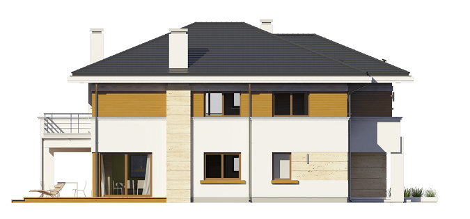 Projekt domu Oceanic to luksusowy piętrowy dom dla 4- 6-osobowej rodziny o nowoczesnej zwartej bryle, z ciekawym detalem i materiałami wykończeniowymi. Piętrowa prostokątna sylwetka została tutaj nakryta łagodnym czterospadowym dachem, z szerokimi okapami. Elewacja podzielona została na poziome pasy: na parterze – część murowana i obłożona kamieniem, na piętrze - okładzina drewniana ścian. Dom dzięki dużym przeszkleniom, właściwym proporcjom elewacji, ma w sobie lekkość. Szczególnie elewacja ogrodowa jest bardzo otwarta. Front domu jest nieco bardziej masywny, solidny, z mniejszymi oknami, aby w naturalny sposób swoistą barierę dla wnętrza od ulicy. Wnętrze domu ma maksymalnie prosty program i układ funkcjonalny. Na parterze mieści się duża część dzienna, z salonem, jadalnią, obszerną kuchnią i holem ze schodami. Dodatkowo na parterze mamy ładny podwójny garaż, kotłownię i pokój - gabinet / sypialnię gościnną. Na piętrze natomiast mieści się aż pięć pokoi - bardzo rzadko spotykana rzecz w tej wielkości domach. Pięć pokoi, pralnia suszarnia, dwie łazienki i centralna duża garderoba. Oczywiście podział pomieszczeń można inaczej zaplanować, ale najważniejszy jest fakt, że piętro jest bardzo pojemne. Projekt domu Oceanic to propozycja dla wszystkich tych przyszłych właścicieli domu, którzy cenią sonie nowoczesny wygląd domu, nie lubią poddaszy ze skosami, potrzebują mieć sporo przestrzeni ukrytych w pokojach - poza salonem. Jednocześnie jak na swoją wielkość dom ma na tyle zwartą bryłę i prostą konstrukcję, że koszt jego realizacji nie jest bardzo wysoki. Projekt domu Oceanic został zaprojektowany jako energooszczędny, z dużą ilością dobrych ociepleń, oraz z wentylacją mechaniczną z rekuperacją.