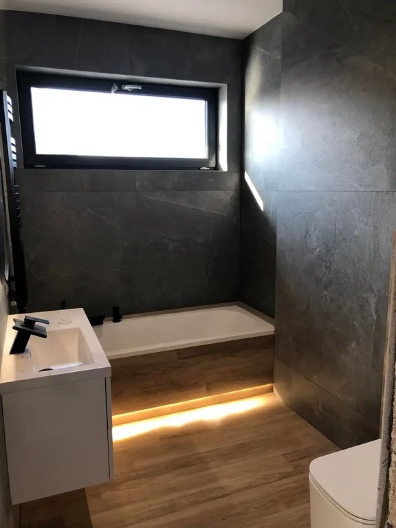 Projekt domu Riwiera 4 to wariant popularnego projektu Riwiera 2 - tym razem z dwustanowiskowym garażem. Projekt domu Riwiera 4 to piętrowy budynek, przewidziany dla 4- 5-osobowej rodziny, przykryty łagodnym wielospadowym dachem, z wbudowanym - częściowo wystającym poza obrys bryły domu - podwójnym garażem. Budynek zaprojektowano w stylu miejskiej nowoczesnej willi, z łagodnymi dachami i dużymi przeszkleniami. Elewacje podzielone zostały na poziome pasy, a ściany urozmaicone różnymi materiałowymi okładzinami. Charakterystycznym elementem domu są piękne duże okna, których część sięga od podłogi do sufitu, zapewniając dużo światła i piękne widoki na ogród z części dziennej. Wnętrze domu podzielono na część dzienną na parterze, oraz sypialnie na piętrze. Parter to otwarta duża przestrzeń dzienna, z salonem, holem i kuchnią, z wydzieloną częściowo jadalnią. Otwarty hol stanowi centrum domu. Z niego dostajemy się reprezentacyjnymi schodami na górę, lub obszernym przedsionkiem na zewnątrz, albo do części gospodarczej domu - do kotłowni i garażu. Na parterze znajduje się dodatkowy pokój (gabinet lub sypialnia gościnna), oraz wc z natryskiem. Nad jadalnią zostawiono otwarty sufit na antresolę piętra, z oknami o wysokości dwóch kondygnacji, z widokiem na ogródek. Reprezentacyjna ściana kominkowo-telewizyjna będzie ozdobą całego domu. Z salonu wychodzimy na częściowo zadaszony taras i do ogrodu. Na piętrze przewidziano cztery sypialnie, w tym apartament rodziców w osobnej części domu, z własną łazienką i garderobą. Sypialnie dziecięce mają dodatkową łazienkę - z holu. Istnieje możliwość zamknięcia pustki nad salonem i zaprojektowania piątego pokoju na piętrze. Projekt domu Riwiera 4 to przemyślany, bardzo funkcjonalny, energooszczędny dom jednorodzinny. Jego koszt budowy wypada korzystnie w stosunku do uzyskanej powierzchni (pozbawionej skosów), oraz komfortu i wygody mieszkania. Dostępna jest opcja w projekcie ze stropem monolitycznym nad parterem i piętrem, wersja w odbiciu lustrzanym projektu oraz inne wersje: bazowa (projekt Riwiera), wersja najmniejsza (projekt domu Riwiera 2) wersja poszerzona (projekt domu Riwiera 3) oraz zmodyfikowana i ulepszona wersja bazowego projektu (Projekt domu Riwiera 5). Zapraszamy!
