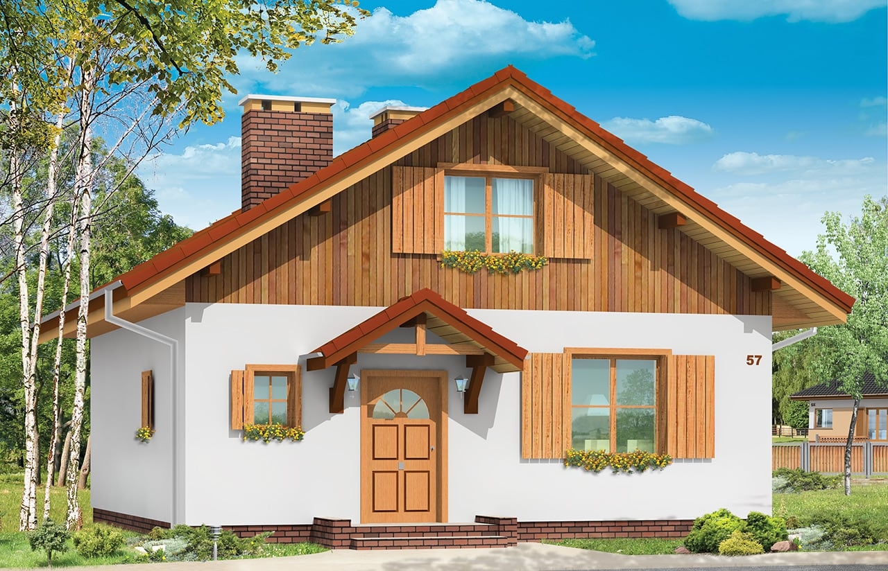Projekt domu Pchełka to jedna z nowszych propozycji pracowni. Jest to dom przeznaczony dla 4- 5-osób. Może być wykorzystany jako jednorodzinny dom całoroczny, lub jako domek letniskowy. Prosta bryła budynku zaprojektowana została na planie kwadratu i przekryta dwuspadowym dachem. Elewacje ozdobione została ładnymi okapami, daszkami wejściowymi i ogrodowymi. Projekt domu Pchełka posiada zróżnicowaną elewację - parter zaprojektowano jako tynkowany, poddasze - obłożone okładziną drewnianą. Domek jest bardzo zgrabny, ma dobrze dobrane proporcje i skalę. Ze względu na klarowny układ konstrukcji budowa domu powinna być łatwa i niedroga. We wnętrzu domu, na parterze zaplanowano salon z częścią jadalną połączony z kuchnią, pomieszczenie gospodarcze, łazienka i pokój - sypialnia rodziców. Na poddaszu z kolei zaplanowano dwie sypialnie dzieci i łazienkę. Dom Pchełka został zaprojektowany tak, aby możliwe było wykończenie poddasza w drugim etapie. Dostępne jest odbicie lustrzane projektu oraz wersja z garażem (Projekt domu Pchełka z garażem). Zapraszamy!