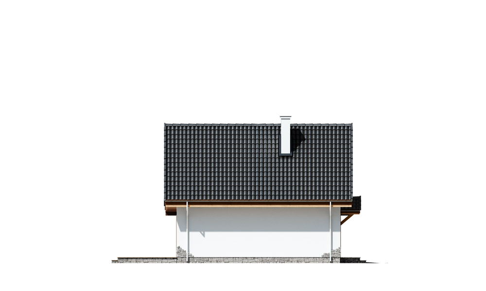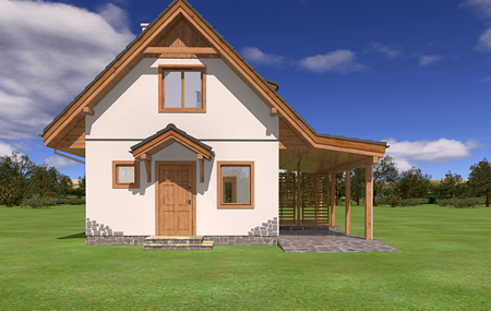 Projekt domu Szarejka ma bardzo prostą konstrukcję, zbudowaną na planie prostokąta. Bryła jest przykryta dwuspadowym dachem o kącie nachylenia 45 stopni (zadaszenie wiaty ma kąt nachylenia 7,9 stopnia). Prosta, bezpretensjonalna forma i detale wykończenia elewacji dają w efekcie ciekawy wygląd domku. Projekt domu Szarejka została zaprojektowana z myślą o maksymalnym otwarciu wnętrza na ogród. Z tego powodu zaplanowany jest duży, częściowo zadaszony taras, do którego dostajemy się z salonu przez szerokie, przeszklone drzwi. Taras dopełnia wnętrze i stanowi jego przedłużenie. Będzie można na nim udanie spędzać czas również przy niepogodzie lub przy zbyt ostrym słońcu – pomocny jest duży podcień. Plan domu Szarejka uwzględnia również bardzo przydatną wiatę garażową. Jeżeli właściciele będą chcieli, może ona służyć nie tylko jako schronienie auta, ale miejsce magazynowania drewna do kominka czy sprzętów ogrodowych.
