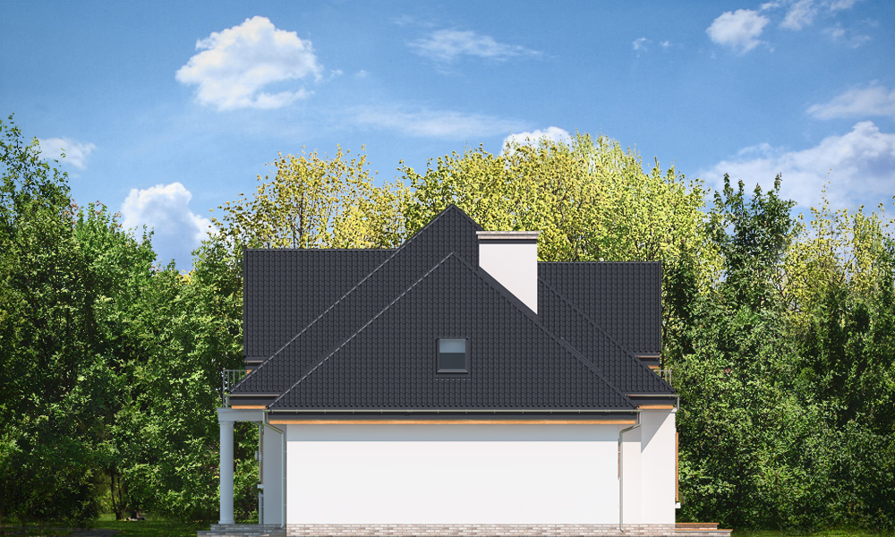 Willa Julia 2 to dom z poddaszem użytkowym, z dobudowaną częścią garażową z obszernym podwójnym garażem. Dom Willa Julia 2 łączy w sobie nowoczesne materiały, detale i technologie, z klasyczną tradycyjną formą. Czterospadowy dach projektu Willa Julia 2 urozmaicony szerokimi lukarnami, w połączeniu ze ścianami tworzy proporcjonalny budynek o właściwej skali. Do budynku Willa Julia 2 wchodzimy przez podcień wejściowy z balkonem na poddaszu, z kolumnami po bokach. Przez szerokie drzwi z naświetlami przechodzimy do wnętrza. Elewacja ogrodowa projektu Willa Julia 2 ozdobiona jest lukarną z balkonem, wykuszem salonu z pięknym dużym oknem, oraz podcieniem w narożniku budynku, zadaszającym część tarasu. Czarny dach i białe elewacje nadają budynkowi czystości i nowoczesnego wyrazu. We wnętrzu projektu Willa Julia 2 zaplanowano na parterze dużą otwartą przestrzeń dzienną, z salonem, jadalnią, holem z wyeksponowanymi schodami, oraz kuchnią. Przy przedsionku zmieszczono przydatną szatnię, a po drugiej stronie dodatkowy pokój na parterze – biuro domowe, lub sypialnię gościnną. Pod schodami przechodzimy do dużego podwójnego garażu z dodatkową przestrzenią gospodarczą, oraz kotłowni. W projekcie domku Willa Julia 2 na poddaszu mamy aż cztery pokoje, w tym sypialnię rodziców z garderobą, dużą łazienkę, oraz pralnię –suszarnię. Willa Julia 2 jest budynkiem energooszczędnym, bardzo dobrze ocieplonym, o zwartej bryle, dzięki czemu koszt budowy domu jest niski. Gotowy projekt domku Willa Julia 2 będzie też prosty w budowie i niedrogi w późniejszym utrzymaniu. Projekt Willa Julia 2 można również zamówić w odbiciu lustrzanym. Zapraszamy również do obejrzenia projektu domu Willa Julia 1.